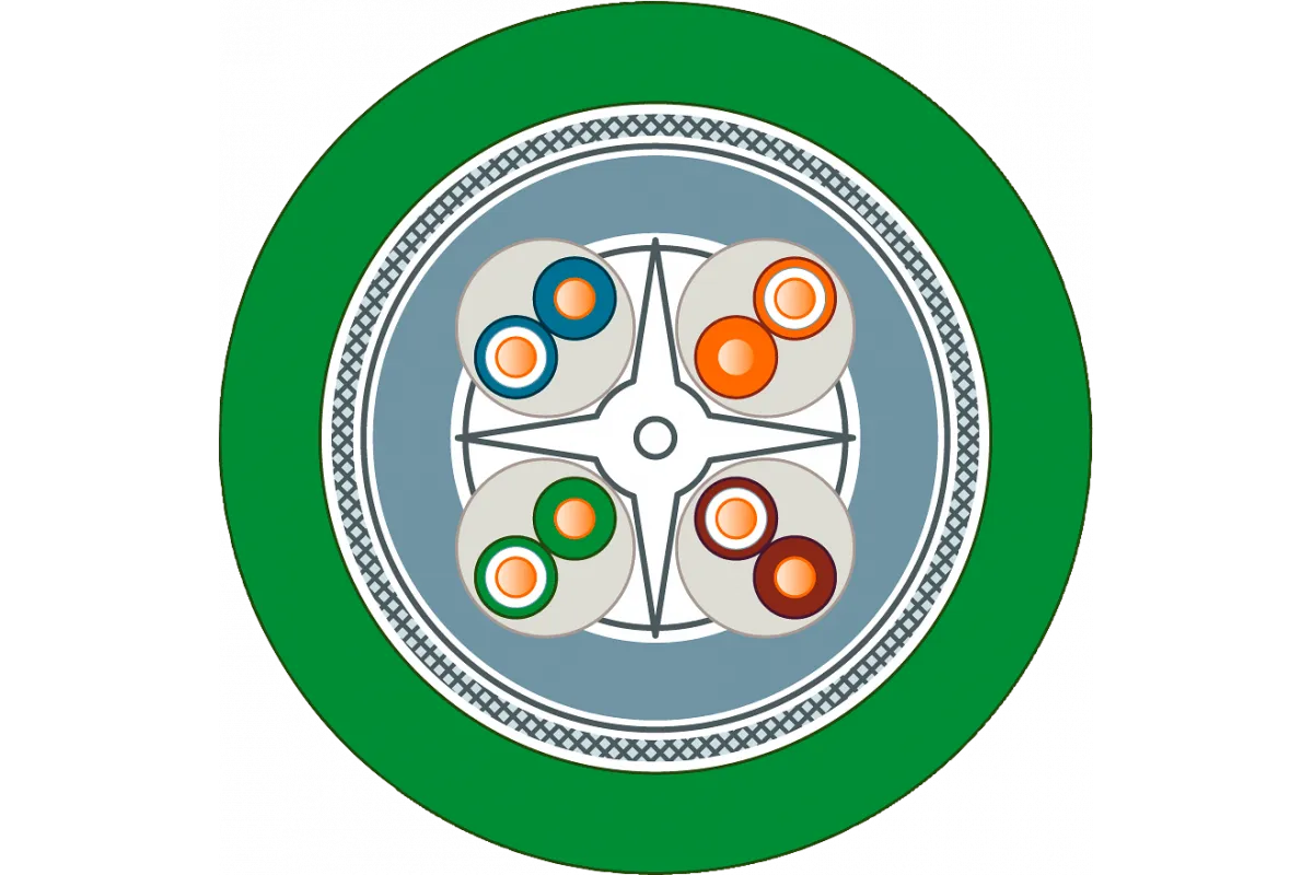 Конструкция кабеля основана на технологии витая пара 4x2 категории Cat6a, что обеспечивает высокую скорость передачи данных и стабильность сигнала. Использование проводников сечением AWG24 гарантирует надежность электрических характеристик и долговечность эксплуатации.