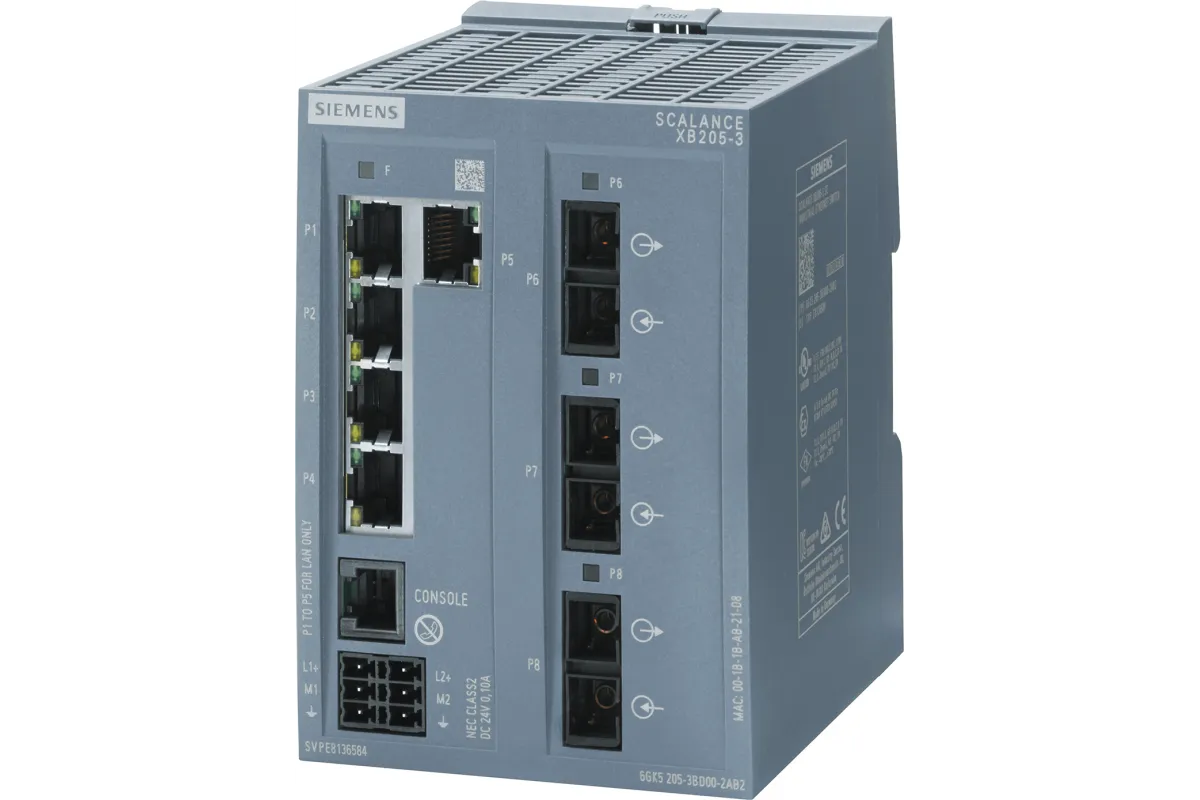 Промышленный управляемый коммутатор Siemens SCALANCE XB205-3 6GK5205-3BD00-2AB2 предназначен для создания надежных управляемых сетей второго уровня в промышленных автоматизированных системах. Устройство оснащено 5 электрическими портами RJ45 10/100 Мбит/с и 3 оптическими портами MM FO SC, что обеспечивает гибкость подключения и возможность работы с медными и оптическими каналами связи. Консольный порт облегчает настройку и диагностику сети.